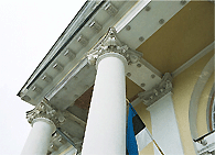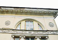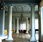 Sama stiil kordub ka interjöörides - seal on kauneimad ruumid esinduslik klassitsistlik saal ning sammastega vestibüül.