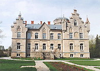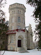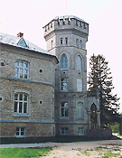 Liigendatud seintega ja astmikviiludega hoone üht nurka kaunistab kaheksatahuline torn.